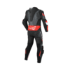 Het pak is uitgevoerd in een stijlvolle combinatie van zwart en rood.