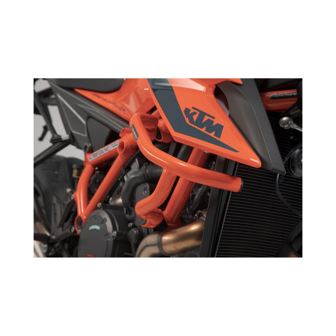 Opvallende oranje valbeugel voor KTM 1290 Super Duke R (vanaf 2019) biedt robuuste bescherming en een unieke, sportieve uitstraling.